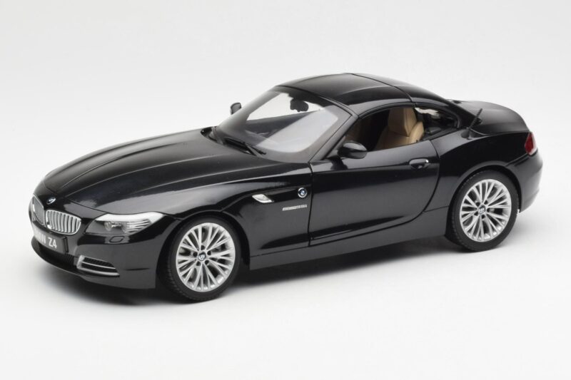 The BMW Z4 E89 Spider Schwarz Metallic Kyosho 1:18 is crafted from Metall. Die-cast zinc alloy body with detailed plastic parts, rubber tires, and high-quality paint finish. Die-cast models are known for their weight, durability, and realistic feel.