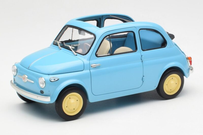 The Fiat Nuova 500 Celeste Blau Kyosho 1:18 is crafted from Metall. Die-cast zinc alloy body with detailed plastic parts, rubber tires, and high-quality paint finish. Die-cast models are known for their weight, durability, and realistic feel.