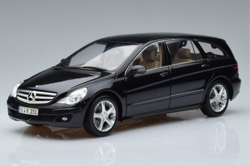 A 1:18 scale model measures approximately 25-28 cm (approximately 10-11 inches). The Mercedes R-Class W251 Obsidian Schwarz Minichamps 1:18 is perfect for display in a glass cabinet or on a shelf.