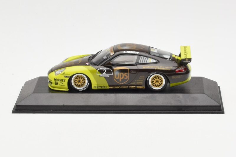 The Porsche 911 996 GT3 Cup #2 UPS Mamerow Minichamps 1:43 is crafted from Metall. Die-cast zinc alloy body with detailed plastic parts, rubber tires, and high-quality paint finish. Die-cast models are known for their weight, durability, and realistic feel.