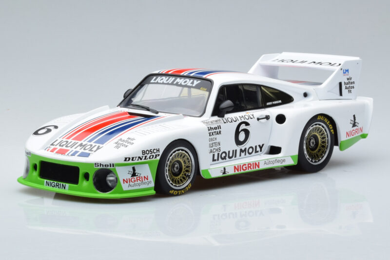 The Porsche 935J #6 Liqui Moly Spa-Francorchamps DRM 1980 MCG 1:18 is crafted from Metall. Die-cast zinc alloy body with detailed plastic parts, rubber tires, and high-quality paint finish. Die-cast models are known for their weight, durability, and realistic feel.